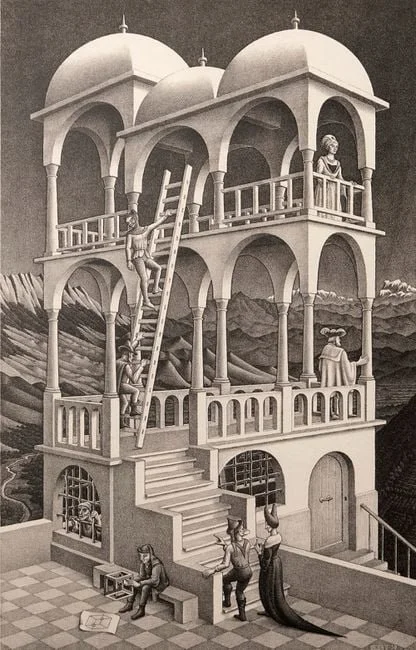 This projected started with researching MC Escher’s different artworks to get a better understanding of how they are made and how they can be interpreted in the physical world. The artwork I ended up choosing to work on is called ‘Belvedere,’ one of his most famous artworks known for being modeled around an impossible cube. This image is shown to the right.